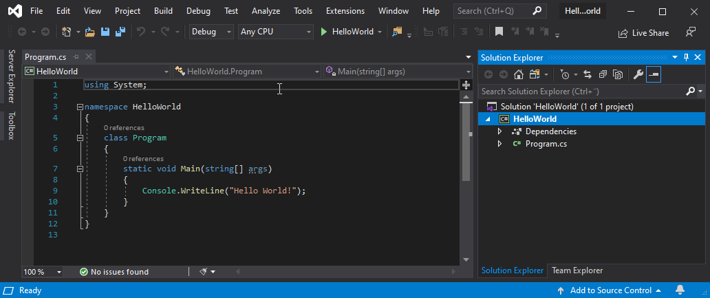 ame\\source\\repos\\HelloWorld\\HelloWorld\\bin\\Debug\\netcoreapp3.0\\HelloWorld.exe (process 13784) exited with code 0.To automatically close the console when debugging stops, enable Tools->Options->Debugging->Automatically close the console when debugging stops.Press any key to close this window . . .